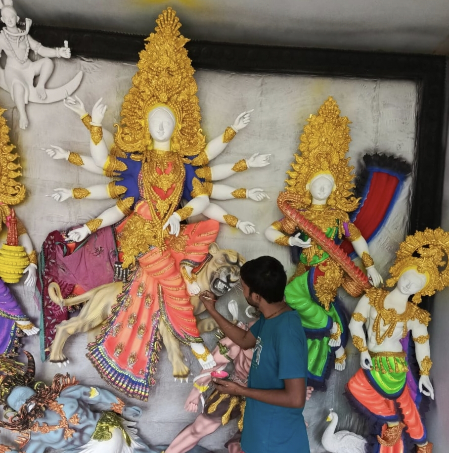 মৃৎশিল্পী গোপাল চন্দ্র পাল জানান, “ এবছর সাতটি প্রতিমা তৈরির কাজ হাতে পেয়েছি। নিয়ামতপুরে চারটি ও সাপাহারে তিনটি। পূজার আর বেশি দেরি নেই। কাজের চাপ অনেক বেশি। দম ফেলার সময় নেই। তাই দিনের পাশাপাশি রাতেও কাজ করতে হচ্ছে।
